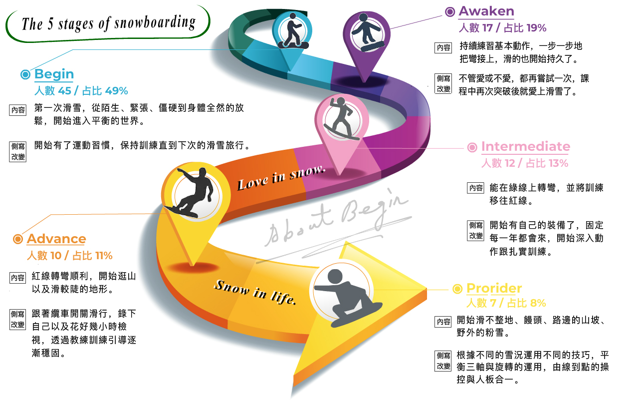 開始滑不整地、饅頭、路邊的山坡、野外的粉雪。根據不同的雪況運用不同的技巧,平衡三軸與旋轉的運用,由線到點的操控與人板合一。