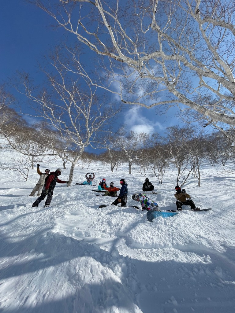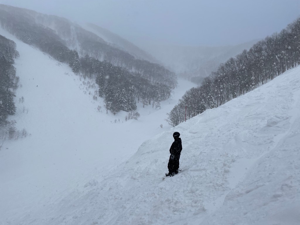 最印象深刻的是去Rusutsu的峽谷。剛開始滑,我就被卡在樹旁,當時起風了,每當站起來就會被風吹倒,中途想要抱著樹,把自己拉起來,但發現樹旁的雪更鬆更難找到施力點,這是我在這次滑雪的過程中第一次有點慌了。心跳加速無法思考,狂風吹得我難以行動,只能靠自己了,後來到底是怎麼爬起來的我也不清楚,可能就是憑著求生的意志力吧。爬起來發現身邊怎麼沒有半個人影,樹林裡只剩狂風呼嘯的聲音。