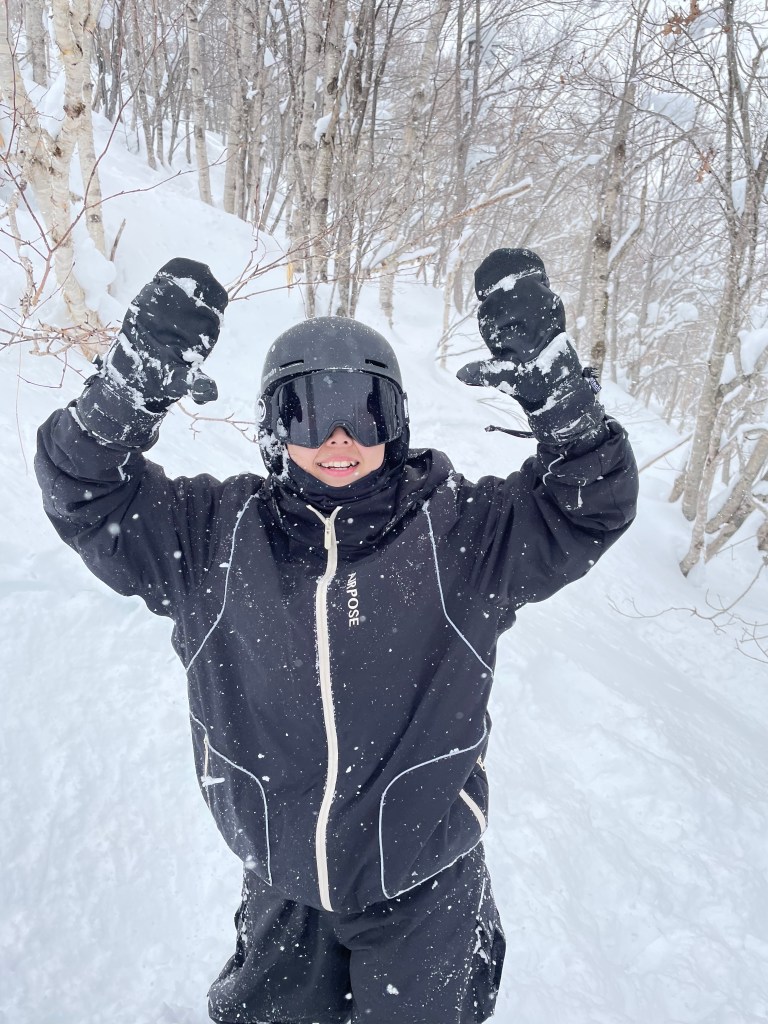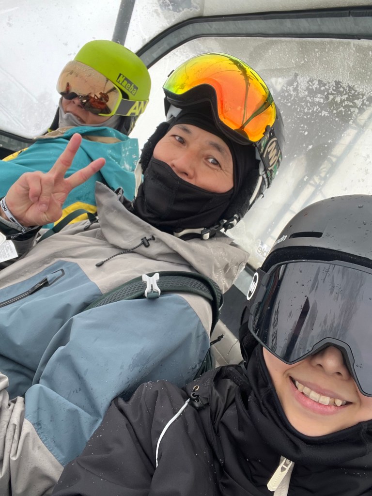 事後才知道原來那條是黑線,漢克說反正那天雪況好可以體驗黑線的粉雪,摔了不痛,陡坡也容易爬起來,中間滑累,還在樹旁玩粉雪(這是種在東南亞長大的孩子們的願望清單)。經過一整天的特訓後,見到大哥的那刻,我對他們兩個喊道:「滑雪真的好快樂啊!」