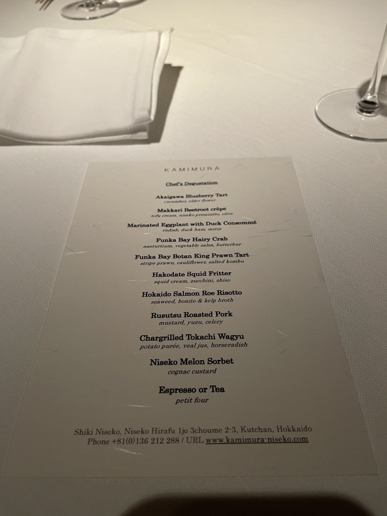 - KAMIMURA–位於Niseko的一星餐廳,價格價高但食材豐富,每道菜都有不同的味道,雞、鴨、豬、和牛、海鮮全都融入到菜色裡,加上精緻的擺盤,很適合旅程中找一天去浪漫與享受。