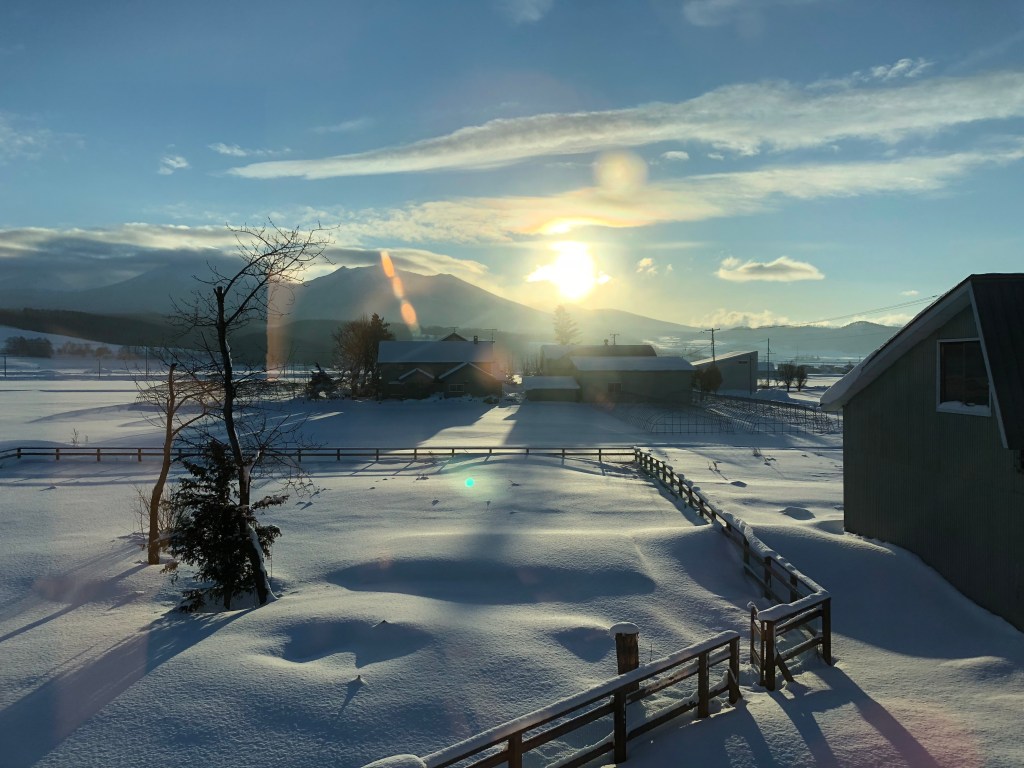 是一間位在中富良野的地方,沿路上就是農村景色,一片寂靜的白,延伸到對面的山頭,不用用鬧鐘吶,陽光照進來就醒了,下圖就是房間看出去的景色。房間真大,可以睡三個人,大約花了一千多台幣就著到如此等級的木屋。